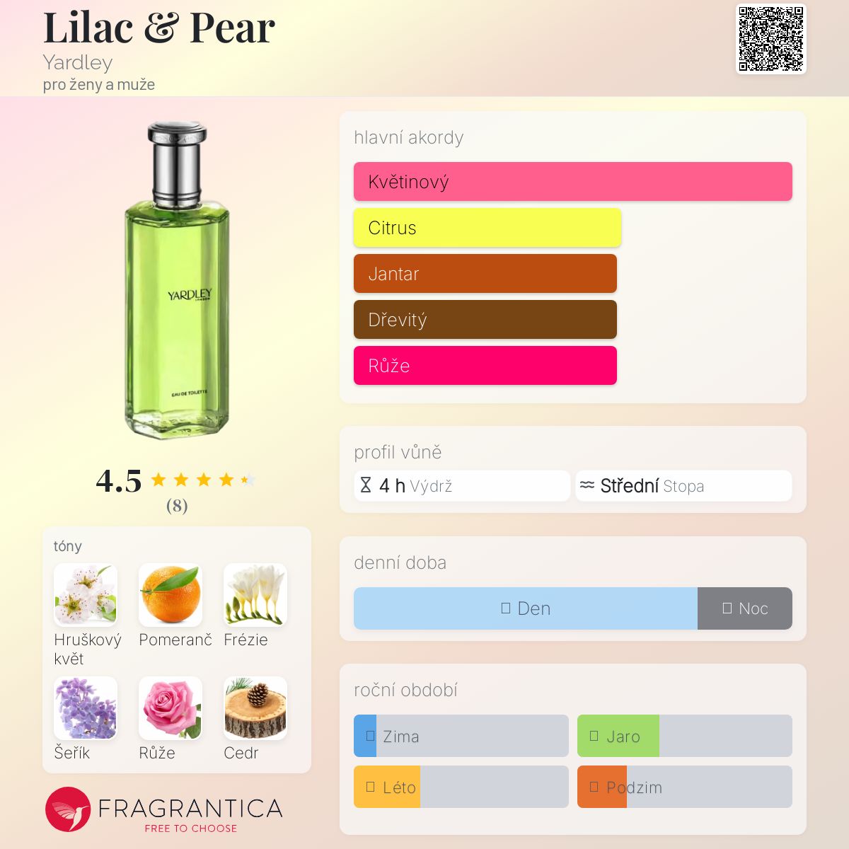 Lilac & Pear podle Yardley je Floral vůně pro ženy a muže. Lilac & Pear byl/a uveden/a v roce 2023. "Nosem" za touto vůní je Marc vom Ende. Vrchní tóny jsou Hruškový květ a Pomeranč; střední tóny jsouFrézie, Šeřík a Růže ; základní tóny jsou Cedr, Jantar (ambra) a Pižmo.