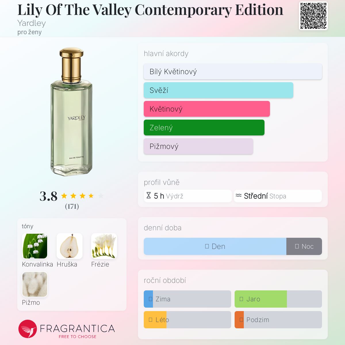 Lily Of The Valley Contemporary Edition podle Yardley je Floral vůně pro ženy. Lily Of The Valley Contemporary Edition byl/a uveden/a v roce 2015. Vrchní tón je Hruška ; střední tóny jsouKonvalinka a Frézie ; základní tón je Pižmo.