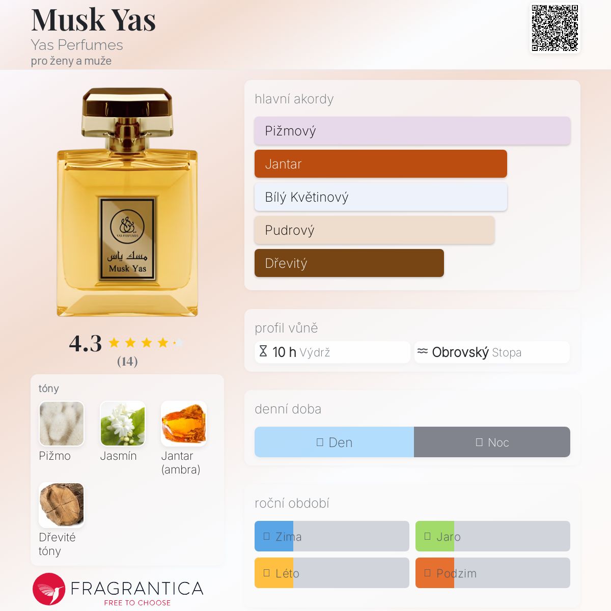 Musk Yas podle Yas Perfumes je Woody Floral Musk vůně pro ženy a muže. Vrchní tón je Bílé pižmo ; střední tón jeJasmín ; základní tóny jsou Jantar (ambra) a Dřevité tóny.