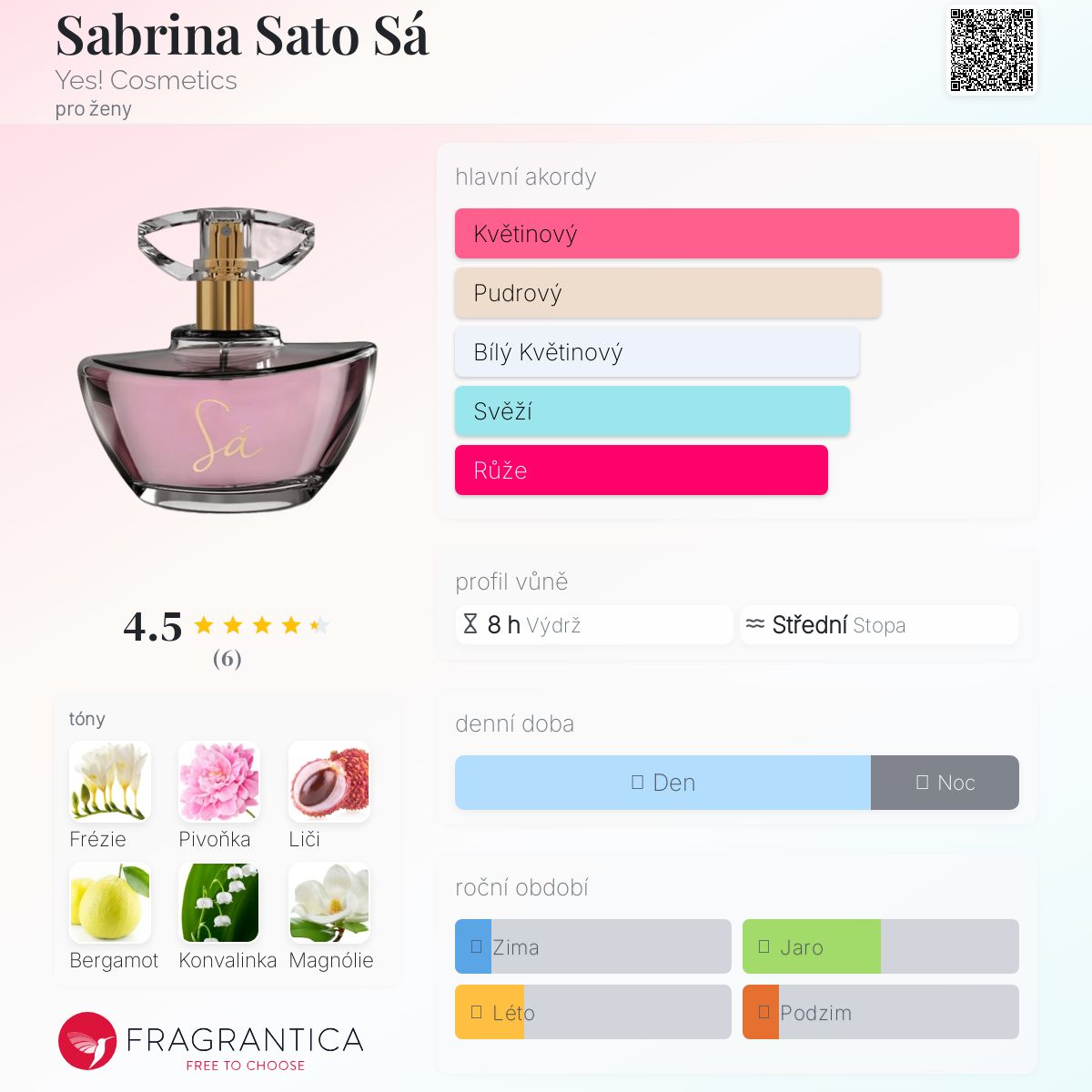 Sabrina Sato Sá podle Yes! Cosmetics je Floral vůně pro ženy. Sabrina Sato Sá byl/a uveden/a v roce 2018. Vrchní tóny jsou Frézie, Pivoňka, Liči a Sicilský bergamot; střední tóny jsouKonvalinka, Magnólie, Bulharská růže, Jasmín a Růžový pepř ; základní tóny jsou Pudrové tóny, Pižmo, Jantar (ambra), Cedr a Bourbonská vanilka.