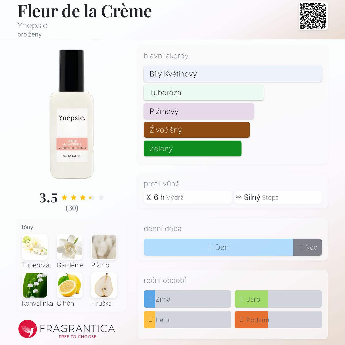 Fleur de la Crème podle Ynepsie je Floral Woody Musk vůně pro ženy. Fleur de la Crème byl/a uveden/a v roce 2022. "Nosem" za touto vůní je Bertrand Duchaufour. Vrchní tóny jsou Citrón, Hruška a Cypřiš; střední tóny jsouTuberóza, Gardénie, Konvalinka a Káva ; základní tóny jsou Pižmo, Ambra a Extrakt z bílého cedru.