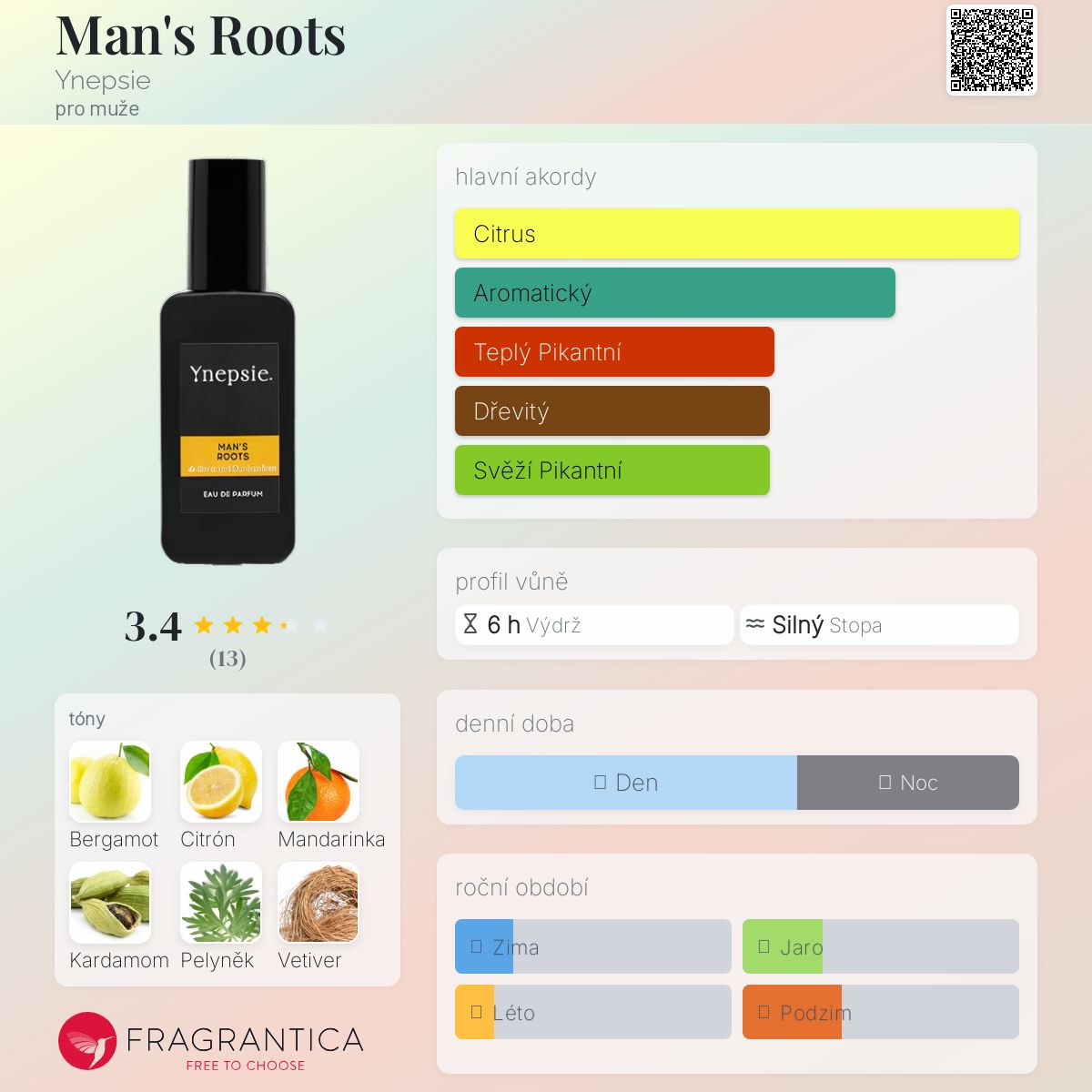 Man's Roots podle Ynepsie je Aromatic vůně pro muže. Man's Roots byl/a uveden/a v roce 2022. "Nosem" za touto vůní je Bertrand Duchaufour. Vrchní tóny jsou Bergamot, Citrón, Zelená mandarinka, Kardamom a Růžový pepř; střední tóny jsouPelyněk, Levandule a Šalvěj ; základní tóny jsou Vetiver, Jantarové dřevo, Pižmo a Santalové dřevo.