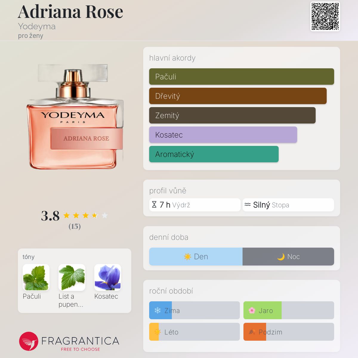 Adriana Rose podle Yodeyma je Orientální Floral vůně pro ženy. Adriana Rose byl/a uveden/a v roce 2018. Vrchní tón je Černý rybíz ; střední tón jeKosatec ; základní tón je Pačuli.