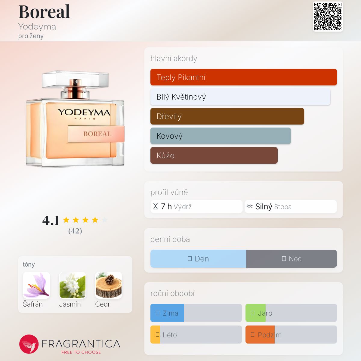 Boreal podle Yodeyma je vůně pro ženy. Toto je nová vůně. Boreal byl/a uveden/a v roce 2024. Vrchní tón je Jasmín ; střední tón jeŠafrán ; základní tón je Cedr.