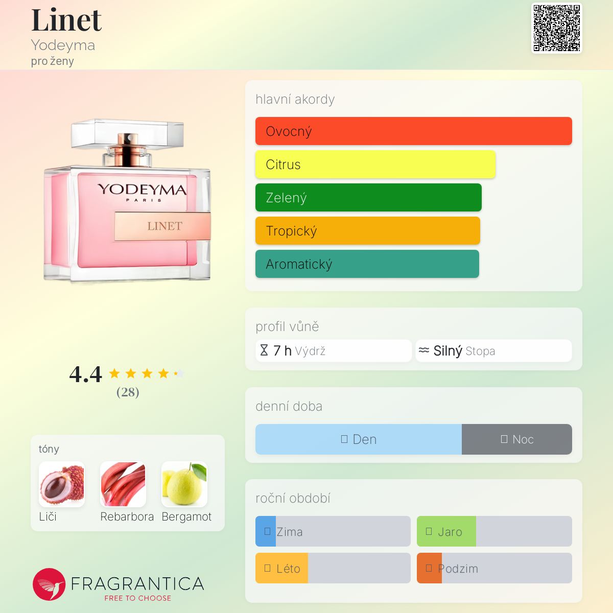Linet podle Yodeyma je vůně pro ženy. Toto je nová vůně. Linet byl/a uveden/a v roce 2024. Vrchní tón je Bergamot ; střední tón jeRebarbora ; základní tón je Liči.