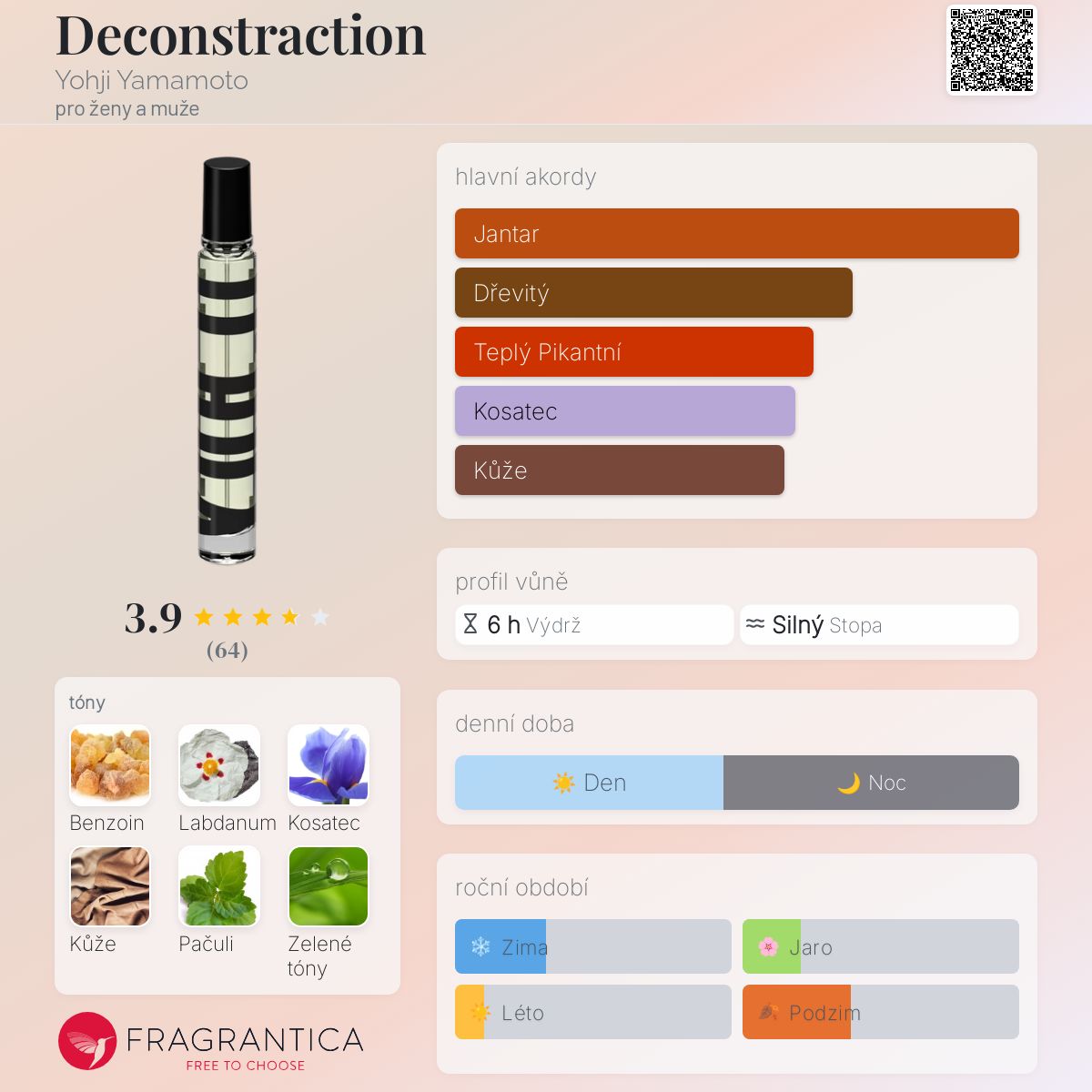 Deconstraction podle Yohji Yamamoto je Orientální Woody vůně pro ženy a muže. Deconstraction byl/a uveden/a v roce 2018. Vrchní tóny jsou Zelený tón a Grapefruit; střední tóny jsouBenzoin, Labdanum, Kosatec a Růže ; základní tóny jsou Kůže, List indonéského pačuli a Texaský cedr.
