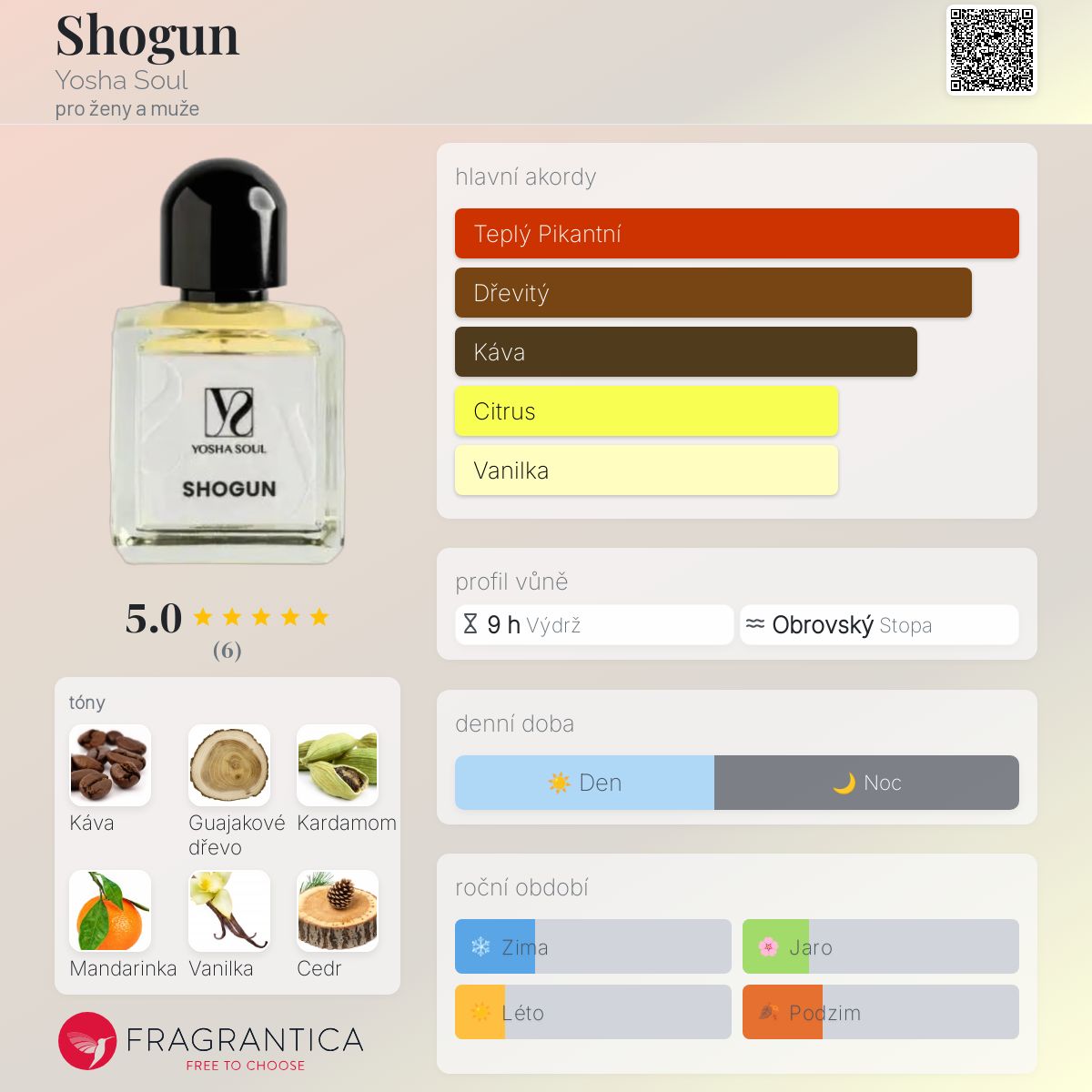 Shogun podle Yosha Soul je Orientální vůně pro ženy a muže. Toto je nová vůně. Shogun byl/a uveden/a v roce 2025. "Nosem" za touto vůní je Hamid Merati-Kashani. Vrchní tóny jsou Káva, Kardamom a Mandarinka; střední tóny jsouCedr a Cypřiš ; základní tóny jsou Guajakové dřevo, Vanilka a Pačuli.