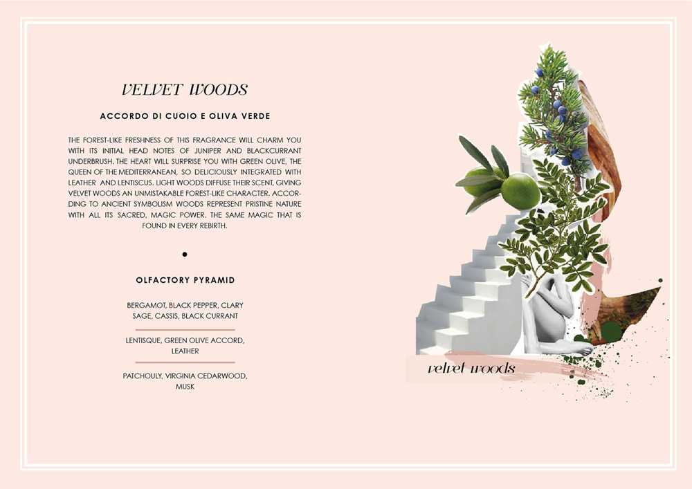 Velvet Woods podle You First Pura Rinascita je Woody vůně pro ženy a muže. Velvet Woods byl/a uveden/a v roce 2015. Vrchní tóny jsou Šalvěj muškátová, Černý pepř, Jalovcové bobulky, Černý rybíz a Bergamot; střední tóny jsouOliva, Masticha a Kůže ; základní tóny jsou Virginský cedr a Pižmo.