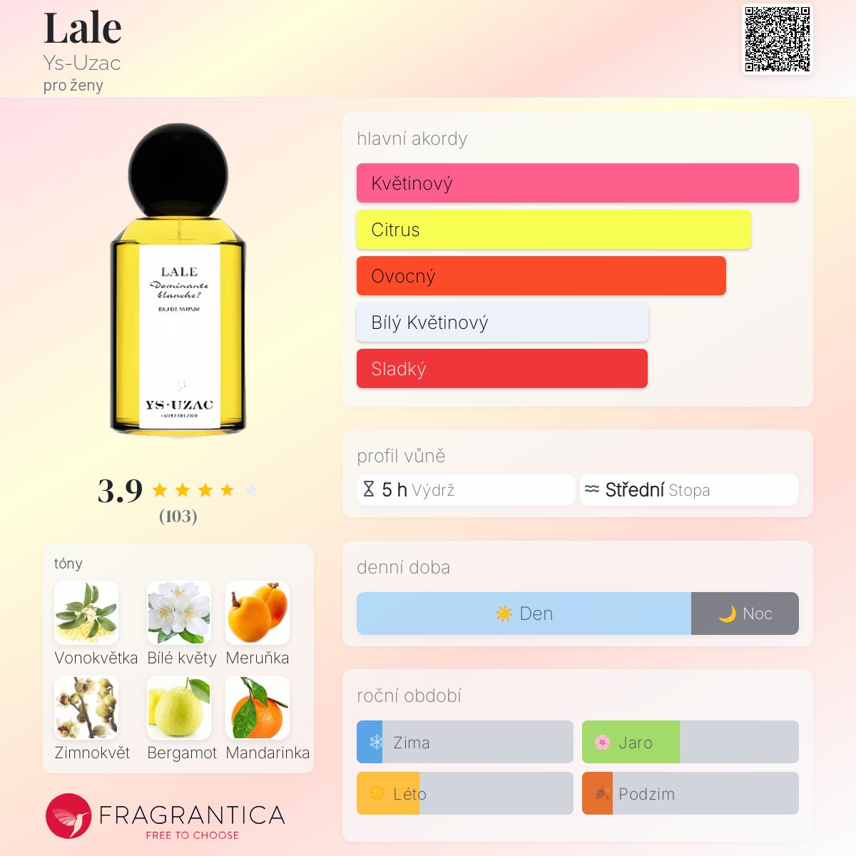 Lale podle Ys-Uzac je Floral Woody Musk vůně pro ženy. Lale byl/a uveden/a v roce 2011. "Nosem" za touto vůní je Vincent Micotti. Vrchní tóny jsou Vonokvětka, Zimnokvět, Bergamot, Mandarinka a Pomeranč; střední tóny jsouBílé květy, Meruňka, Růže, Šafrán a Růžový pepř ; základní tóny jsou Dřevité tóny, Kadidlo, Benzoin a Jantar (ambra).