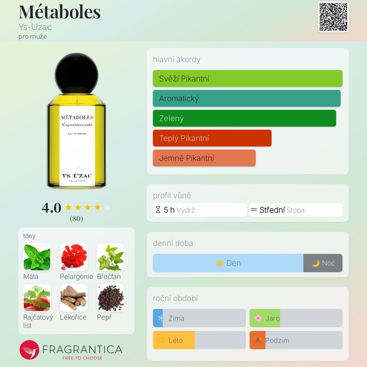 Métaboles podle Ys-Uzac je Aromatic Spicy vůně pro muže. Métaboles byl/a uveden/a v roce 2011. "Nosem" za touto vůní je Vincent Micotti. Vrchní tóny jsou Břečťan, Rajčatový list, Bergamot a Galbanum; střední tóny jsouMáta, Pelargónie, Lékořice, Černý pepř a Hřebíček ; základní tóny jsou Benzoin, Jantar (ambra), Vanilka, Bílé pižmo a Santalové dřevo.