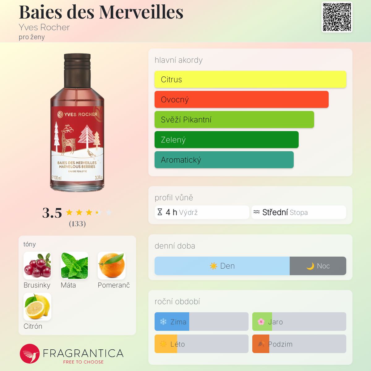 Baies des Merveilles podle Yves Rocher je Aromatic Fruity vůně pro ženy. Baies des Merveilles byl/a uveden/a v roce 2017. Vrchní tóny jsou Pomeranč a Citrón; střední tón jeBrusinky ; základní tón je Máta.