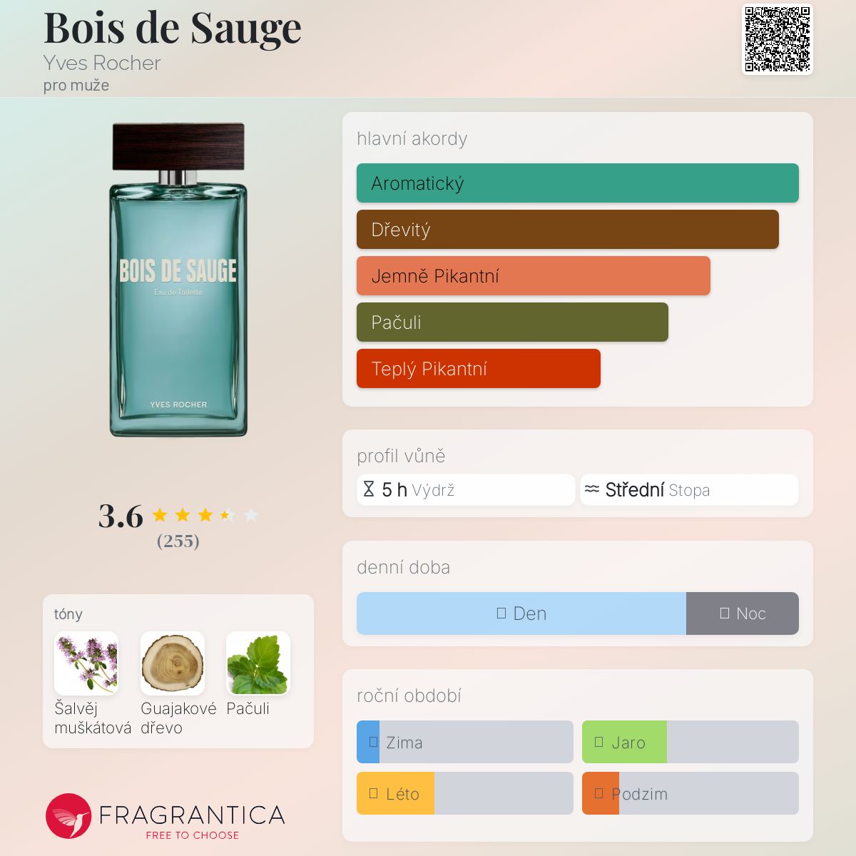 Bois de Sauge podle Yves Rocher je Woody Aromatic vůně pro muže. Bois de Sauge byl/a uveden/a v roce 2020. "Nosem" za touto vůní je Sonia Constant. Vrchní tón je Šalvěj muškátová ; střední tón jeGuajakové dřevo ; základní tón je Pačuli.