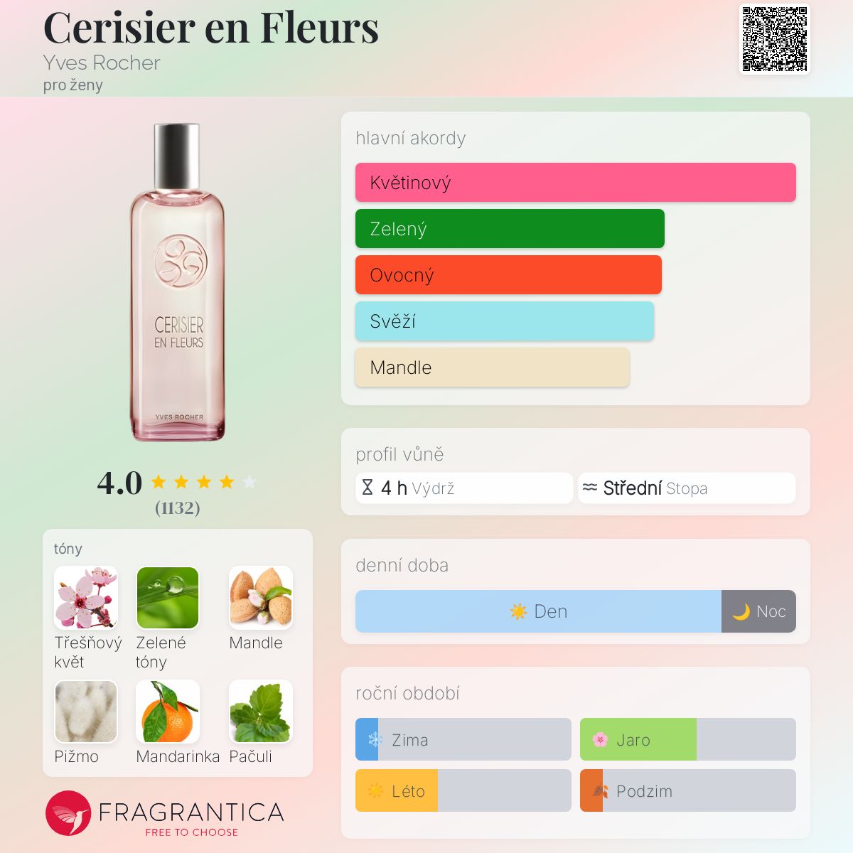 Cerisier en Fleurs podle Yves Rocher je Floral vůně pro ženy. Cerisier en Fleurs byl/a uveden/a v roce 2014. "Nosem" za touto vůní je Francis Kurkdjian. Vrchní tóny jsou Zelené tóny a Zelená mandarinka; střední tóny jsouTřešňový květ a Mandle ; základní tóny jsou Pižmo a Pačuli.