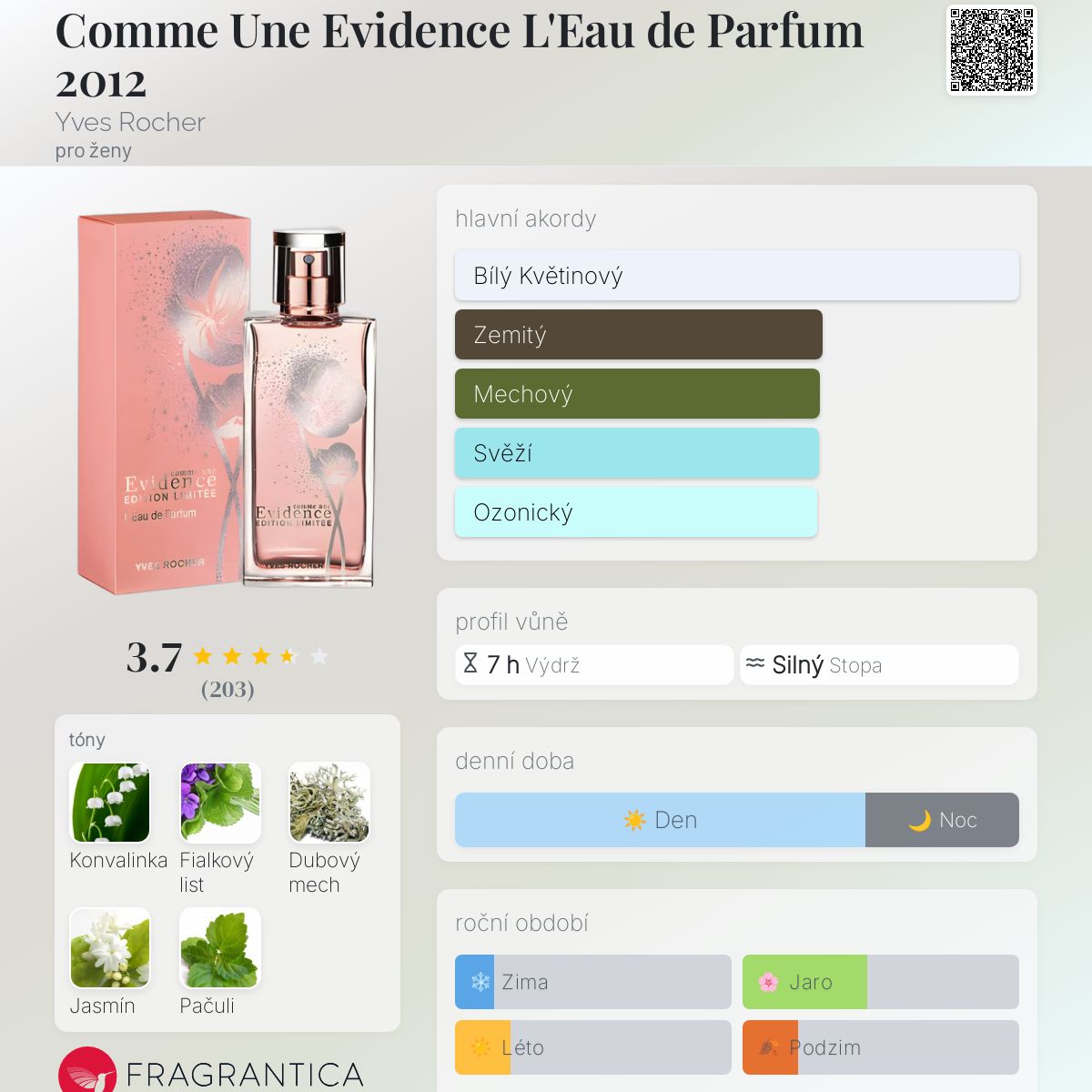 Comme Une Evidence L'Eau de Parfum 2012 podle Yves Rocher je Chypre Floral vůně pro ženy. Comme Une Evidence L'Eau de Parfum 2012 byl/a uveden/a v roce 2012. Vrchní tón je Fialkové listy ; střední tóny jsouKonvalinka a Jasmín ; základní tóny jsou Mech a Pačuli.