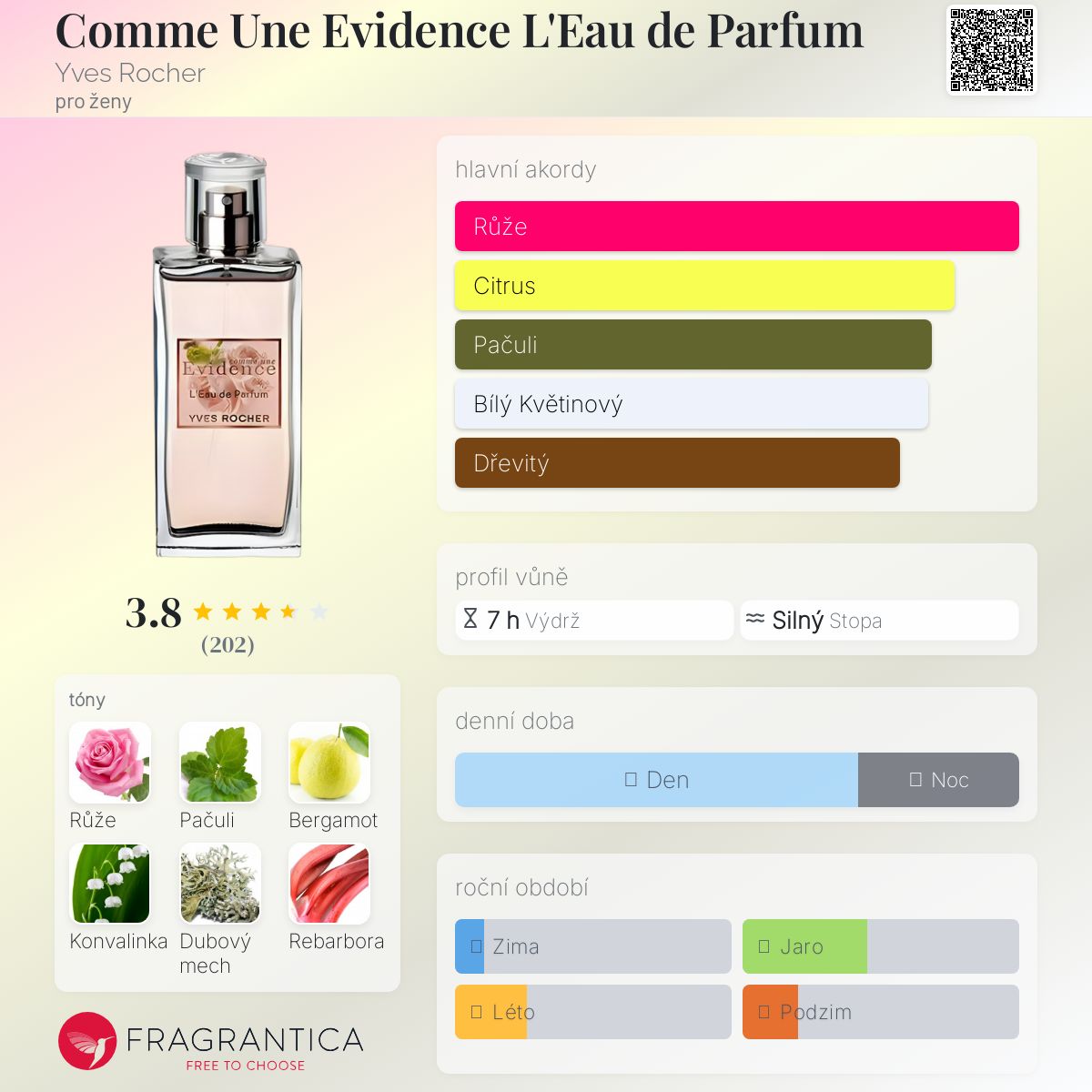 Comme Une Evidence L'Eau de Parfum podle Yves Rocher je Floral vůně pro ženy. Comme Une Evidence L'Eau de Parfum byl/a uveden/a v roce 2017. "Nosem" za touto vůní je Annick Menardo. Vrchní tóny jsou Bergamot, Rebarbora a Petitgrain; střední tóny jsouDamašská růže, Konvalinka a Jasmín ; základní tóny jsou Pačuli, Mech a Pižmo.