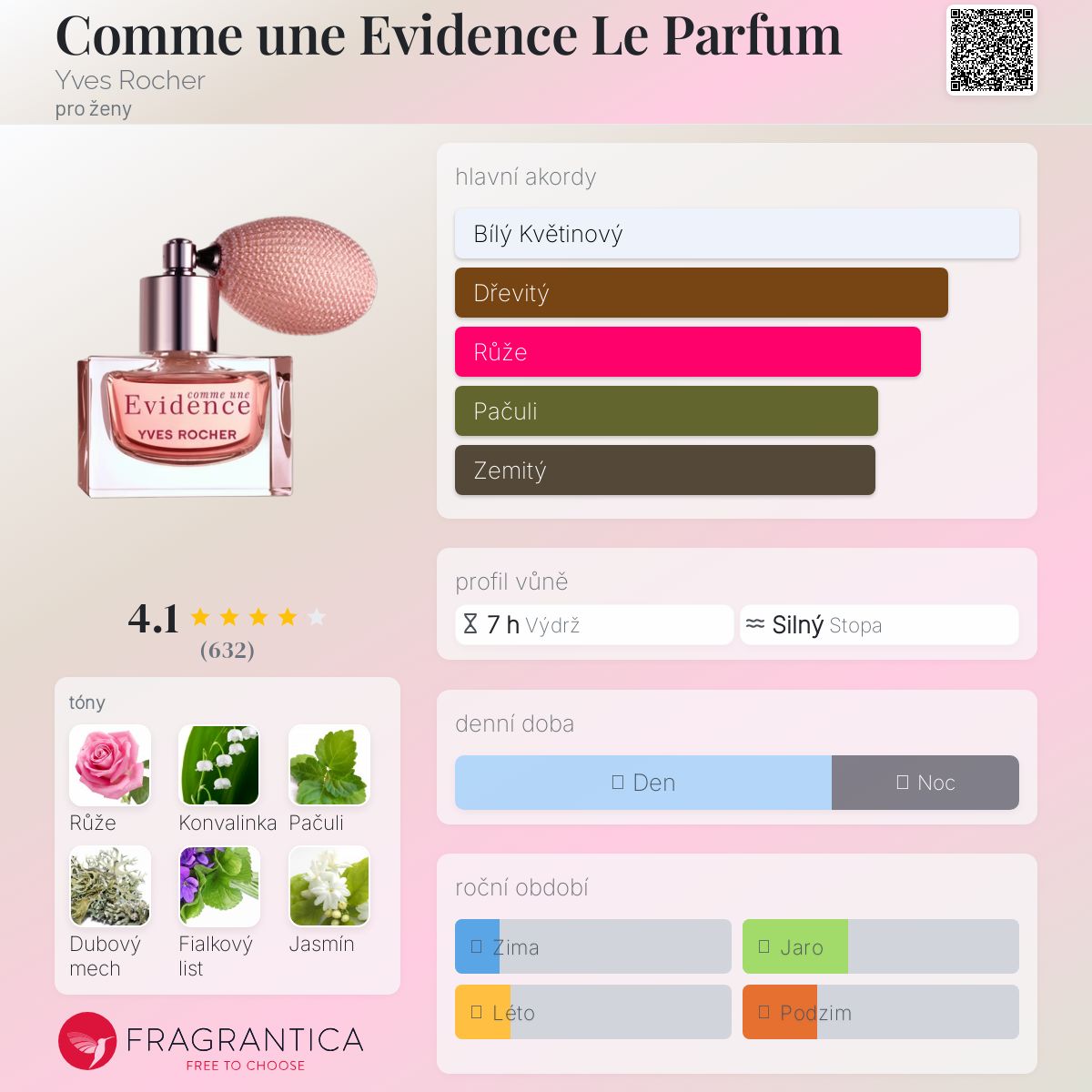 Comme une Evidence Le Parfum podle Yves Rocher je Chypre Floral vůně pro ženy. Comme une Evidence Le Parfum byl/a uveden/a v roce 2008. Vrchní tóny jsou Fialkový list, Muškátový oříšek a Jantar (ambra); střední tóny jsouRůže, Konvalinka a Jasmín ; základní tóny jsou Pačuli, Dubový mech, Pižmo, Dřevité tóny a Pralinka.