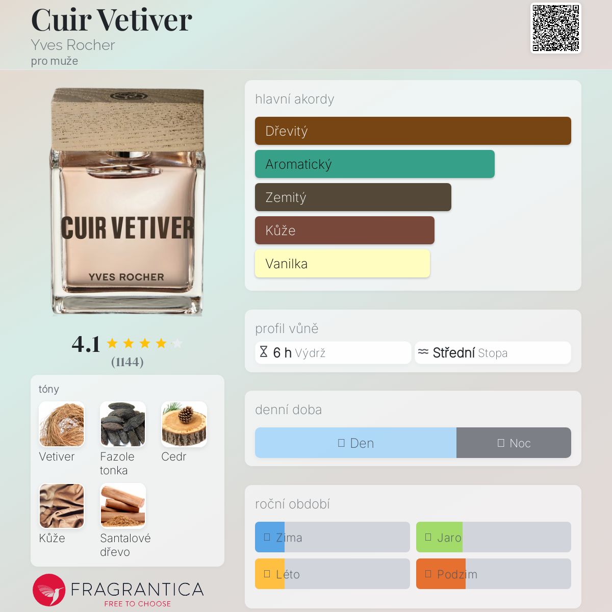 Cuir Vetiver podle Yves Rocher je Leather vůně pro muže. Cuir Vetiver byl/a uveden/a v roce 2016. "Nosem" za touto vůní je Sonia Constant. Vrchní tón je Haitský vetiver ; střední tóny jsouCedr, Kůže a Santalové dřevo ; základní tón je Fazole tonka.