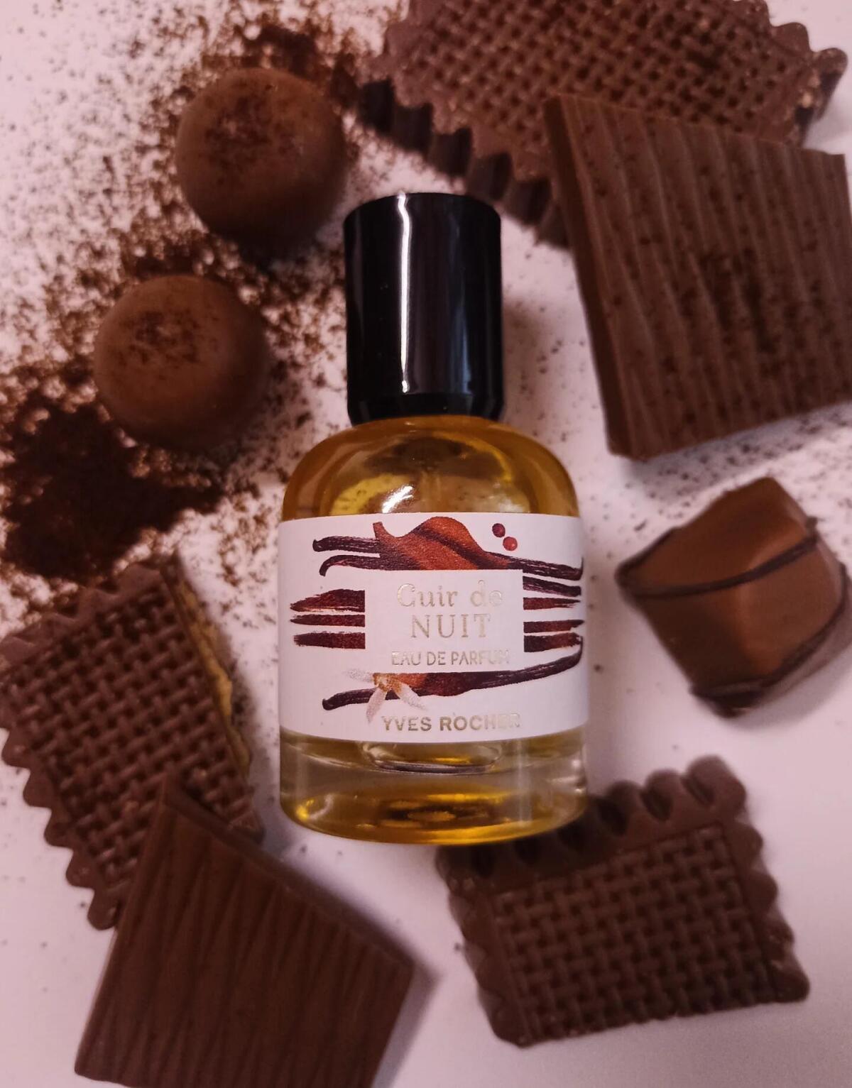 Cuir de Nuit pak na sebe nenechá dlouho čekat, aby přinesla příjemné hluboké tóny, možná trochu skřípavé, ale jemné, zejména čerstvé nepražené a ne příliš čokoládové kakao a příjemnou vanilku, která obvykle značce YR dobře sedí. Káva se také dostaví, ale bez těch módních hořkostí vržených do sladkého parfému.