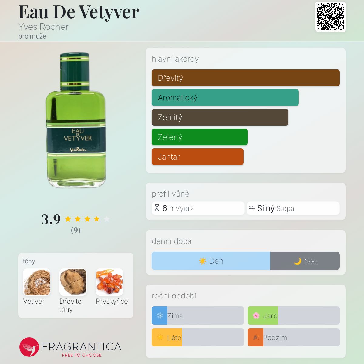 Eau De Vetyver podle Yves Rocher je vůně pro muže. Eau De Vetyver byl/a uveden/a v roce 1982. "Nosem" za touto vůní je Raymond Chaillan.