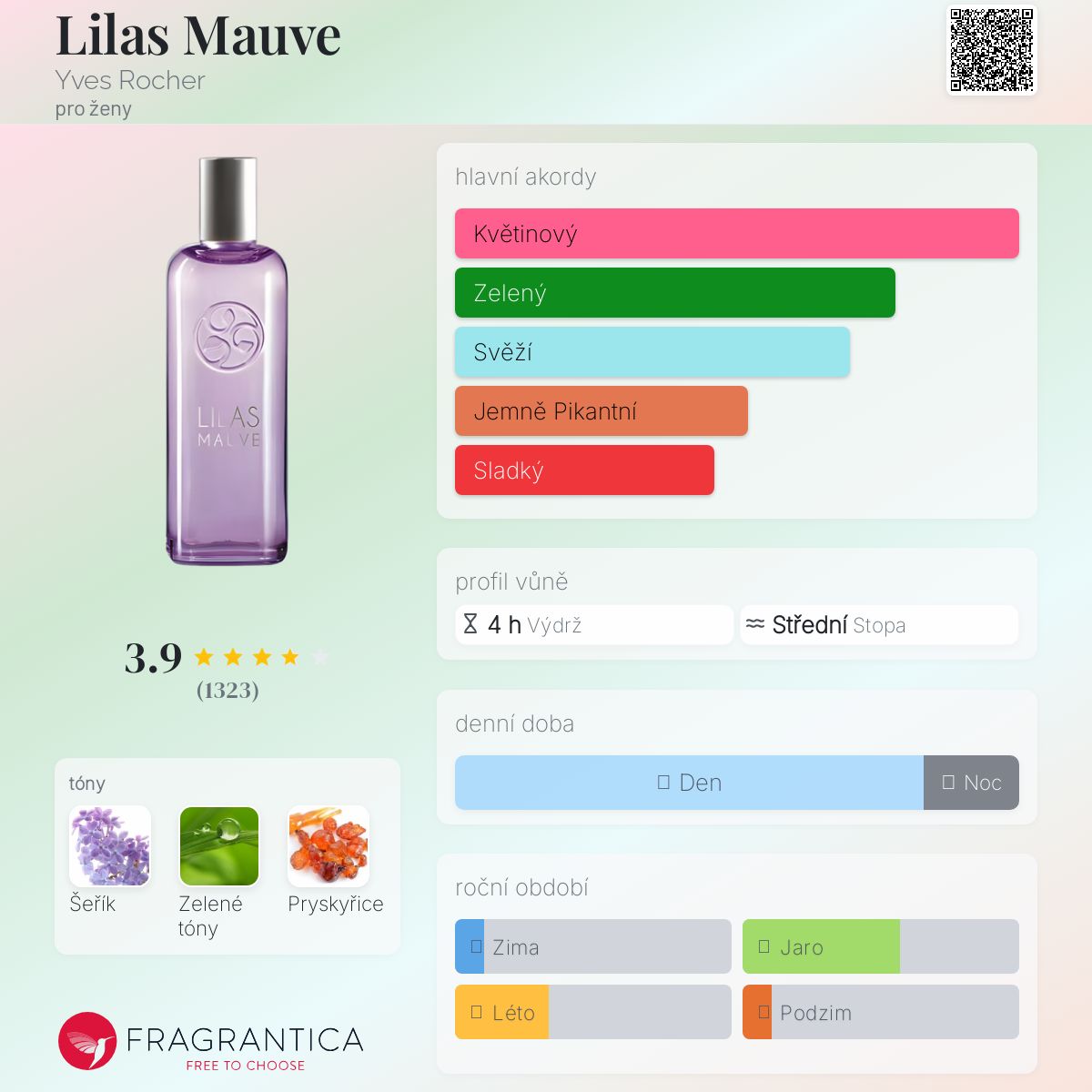 Lilas Mauve podle Yves Rocher je Floral vůně pro ženy. Lilas Mauve byl/a uveden/a v roce 2012. "Nosem" za touto vůní je Annick Menardo. Vrchní tón je Zelené tóny ; střední tón jeŠeřík ; základní tón je Pryskyřice.