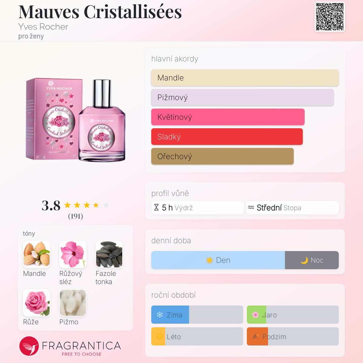 Mauves Cristallisées podle Yves Rocher je Floral vůně pro ženy. Mauves Cristallisées byl/a uveden/a v roce 2012. Vrchní tón je Sladká mandle ; střední tóny jsouRůžový sléz a Růže ; základní tóny jsou Fazole tonka a Bílé pižmo.