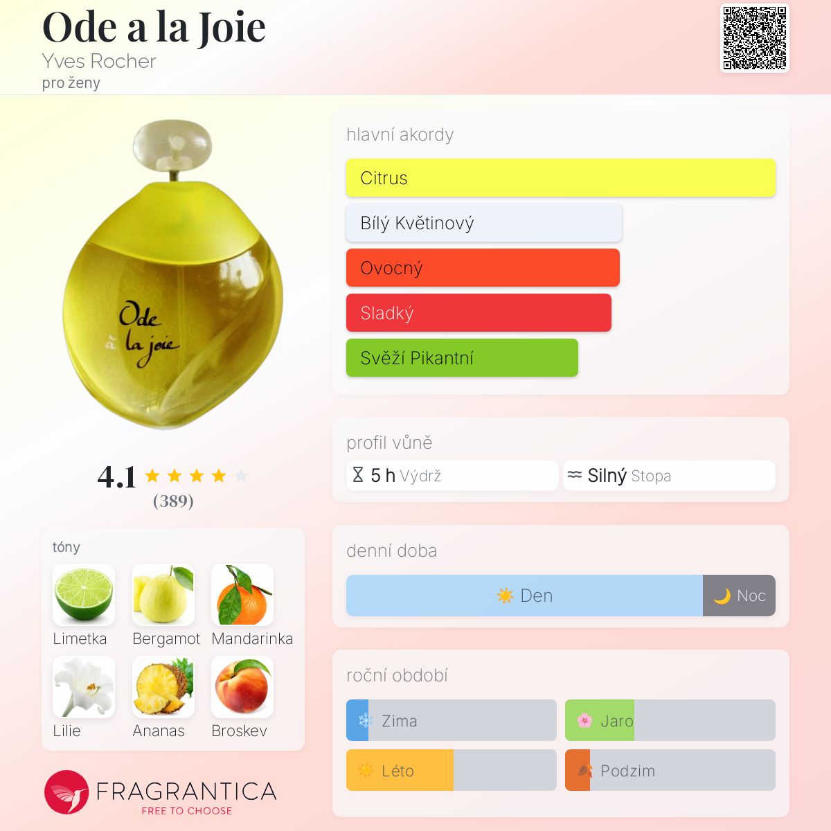 Ode a la Joie podle Yves Rocher je Citrus Aromatic vůně pro ženy. Ode a la Joie byl/a uveden/a v roce 2002.