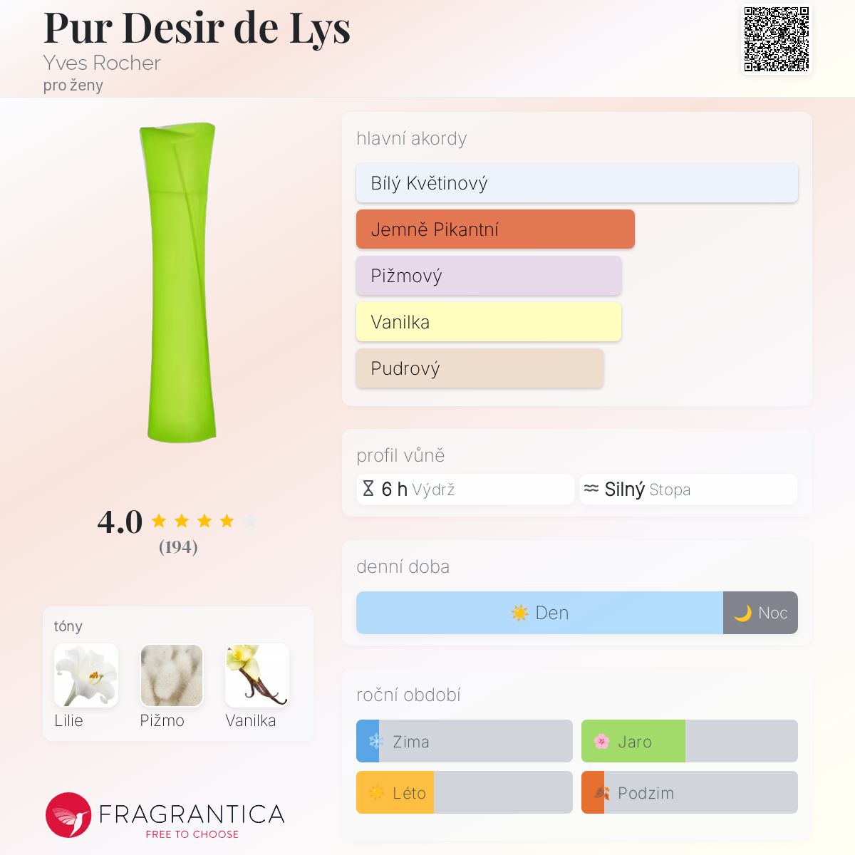 Pur Desir de Lys podle Yves Rocher je Floral vůně pro ženy. Pur Desir de Lys byl/a uveden/a v roce 2002.