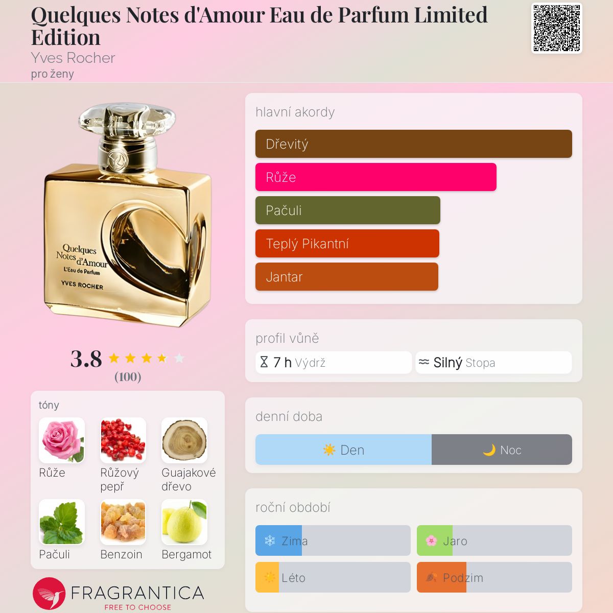 Quelques Notes d'Amour Eau de Parfum Limited Edition podle Yves Rocher je Orientální Woody vůně pro ženy. Quelques Notes d'Amour Eau de Parfum Limited Edition byl/a uveden/a v roce 2015. "Nosem" za touto vůní je Domitille Michalon Bertier. Vrchní tóny jsou Růžový pepř a Bergamot; střední tóny jsouDamašská růže, Guajakové dřevo a Pačuli ; základní tóny jsou Benzoin, Cedr a Amyris.