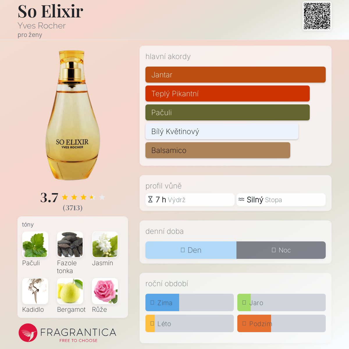 So Elixir podle Yves Rocher je vůně pro ženy. So Elixir byl/a uveden/a v roce 2009. So Elixir byl/a vytvořen/a Olivier Cresp, Marie Salamagne a Jacques Cavallier Belletrud.