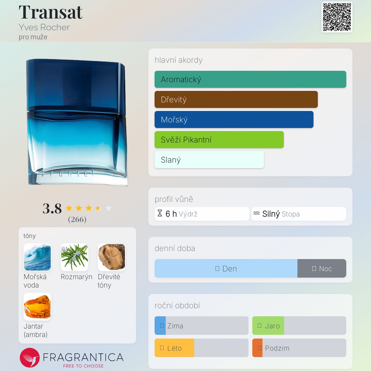Transat podle Yves Rocher je Aromatic Aquatic vůně pro muže. Transat byl/a uveden/a v roce 2005. Vrchní tón je Rozmarýn ; střední tón jeMořská voda ; základní tóny jsou Dřevité tóny a Jantar (ambra).