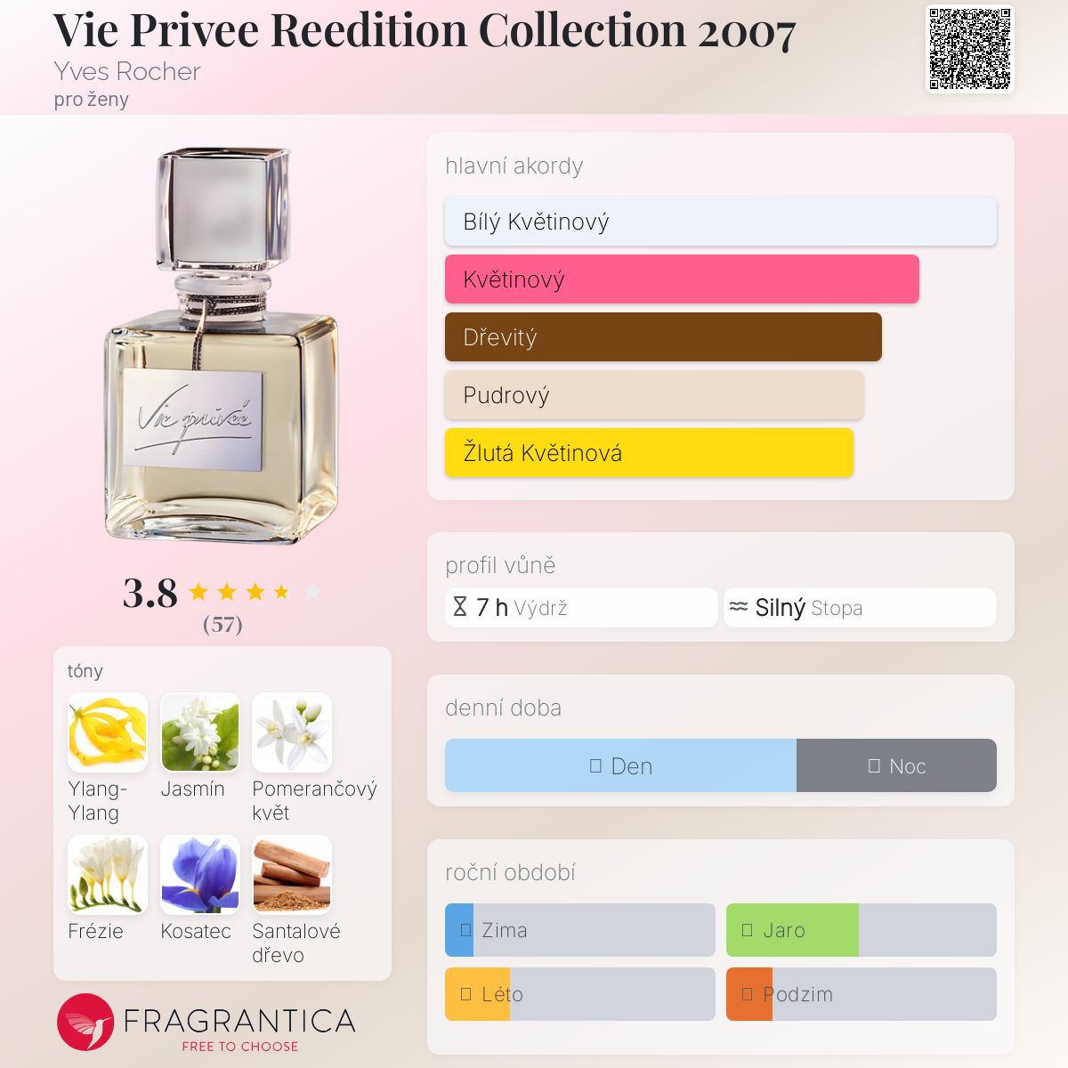 Vie Privee Reedition Collection 2007 podle Yves Rocher je Floral vůně pro ženy. Vie Privee Reedition Collection 2007 byl/a uveden/a v roce 2007. Vrchní tóny jsou Ylang-Ylang a Pomerančový květ; střední tóny jsouJasmín, Frézie a Bulharská růže ; základní tóny jsou Kosatec, Santalové dřevo a Pižmo.