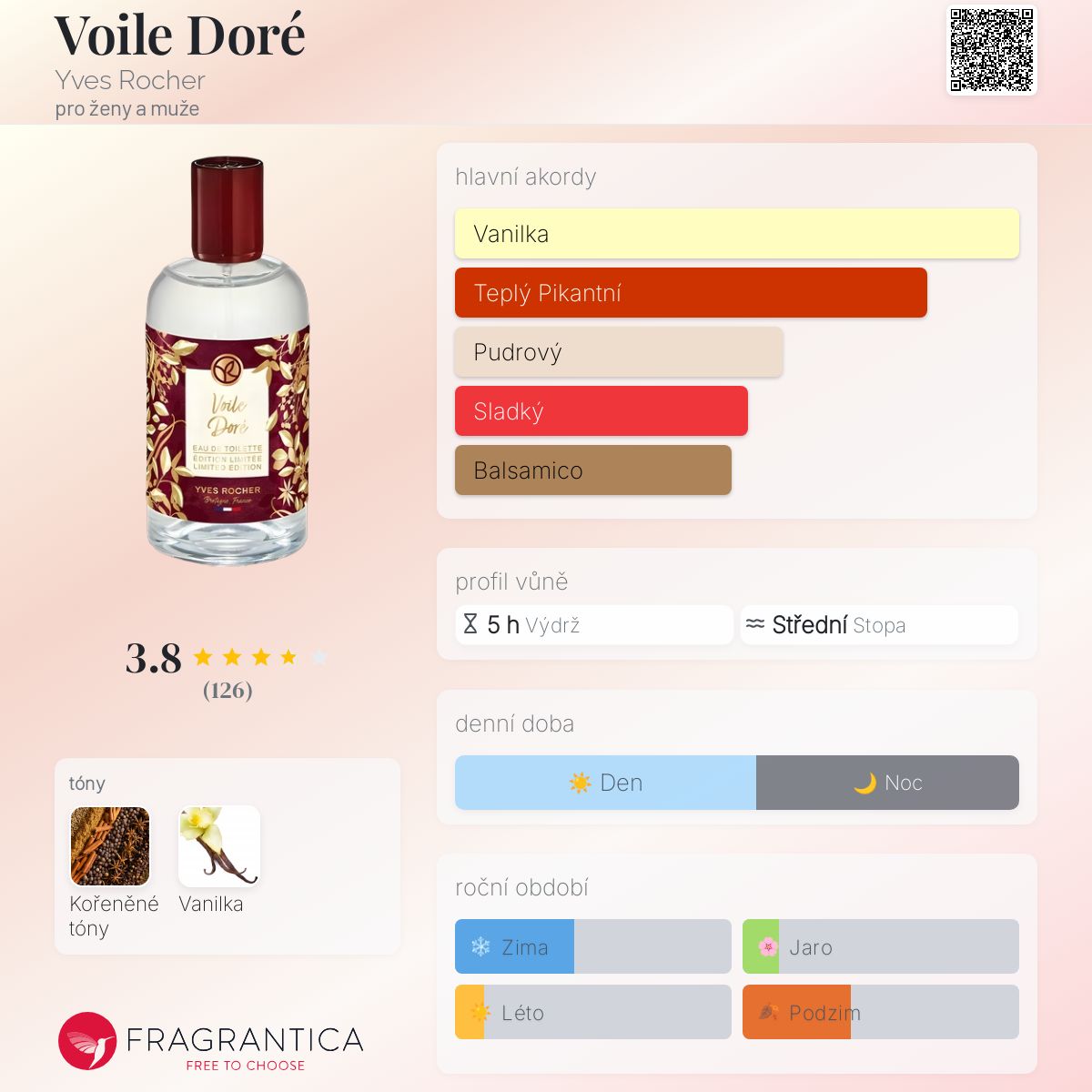 Po vyzkoušení jsem se do něj zamiloval a koupil si ho. Vůně není přehnaně vanilková, ale sladkost je přítomna a určitý závoj, ostatně vůně se tak jmenuje a je zahalující, dobrá na zimu. Z koření cítím skořici, růžový pepř, který je v některých novinkách a mnoha dalších vůních.