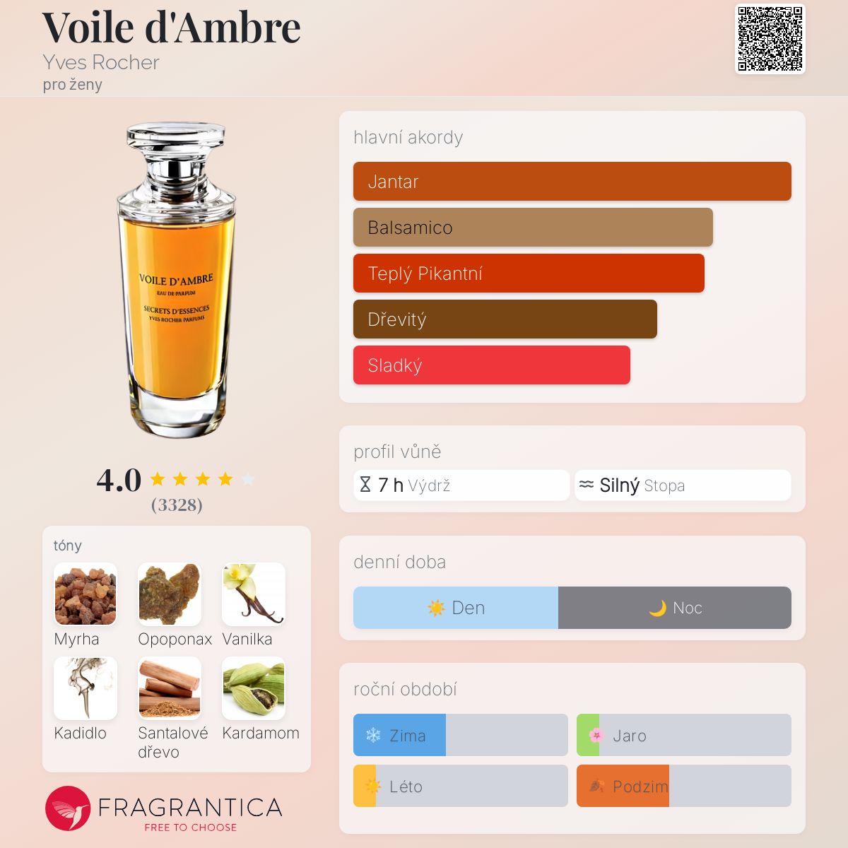 Voile d'Ambre podle Yves Rocher je Orientální Woody vůně pro ženy. Voile d'Ambre byl/a uveden/a v roce 2005. "Nosem" za touto vůní je Olivier Pescheux. Vrchní tóny jsou Kardamom, Mandarinka, Mandarinkový list a Myrta; střední tóny jsouMyrha, Opoponax a Kadidlo ; základní tóny jsou Madagaskarská vanilka, Australské santalové dřevo a Pačuli. Tento parfém je vítězem oceněníFiFi Award Best Packaging Women`s Popular Appeal 2007 .