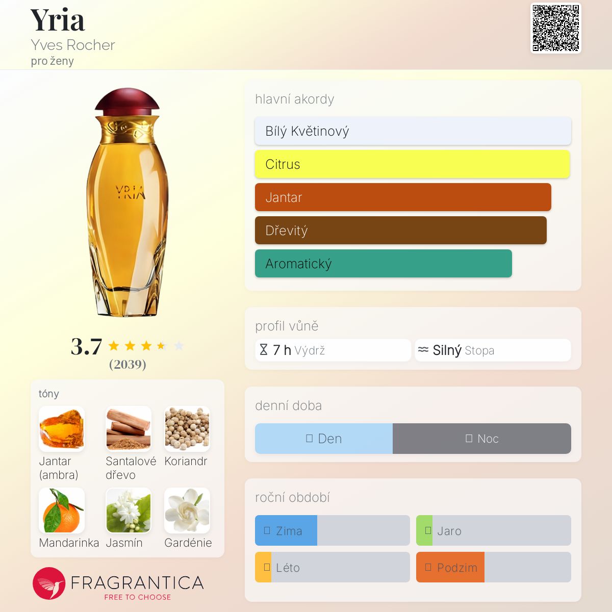 Yria podle Yves Rocher je Floral Fruity vůně pro ženy. Yria byl/a uveden/a v roce 2001. "Nosem" za touto vůní je Laurent Bruyere. Vrchní tóny jsou Koriandr, Mandarinka a Bergamot; střední tóny jsouJasmín, Gardénie, Růže, Magnólie a Konvalinka ; základní tóny jsou Jantar (ambra), Santalové dřevo, Fazole tonka, Vanilka a Pačuli.
