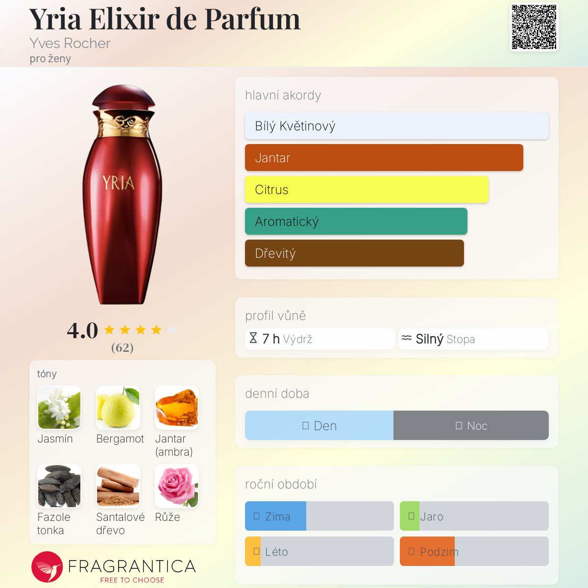 Yria Elixir de Parfum podle Yves Rocher je Orientální Floral vůně pro ženy. Vrchní tóny jsou Bergamot a Koriandr; střední tóny jsouJasmín a Růže ; základní tóny jsou Jantar (ambra), Fazole tonka a Santalové dřevo.
