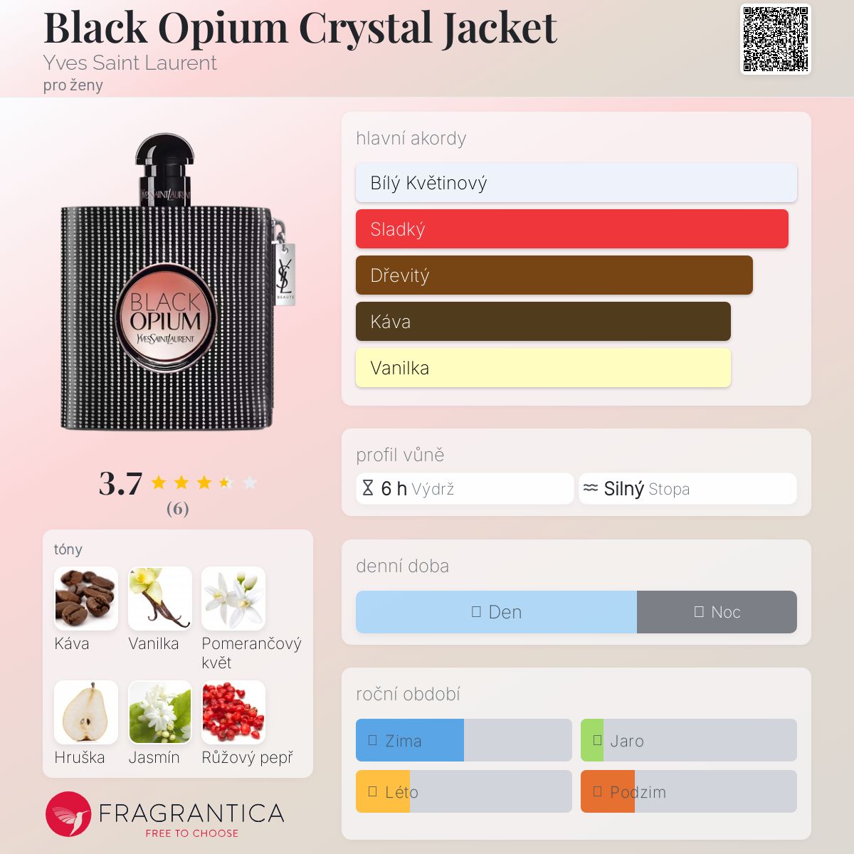 Black Opium Crystal Jacket podle Yves Saint Laurent je Orientální Vanilla vůně pro ženy. Black Opium Crystal Jacket byl/a uveden/a v roce 2019. Black Opium Crystal Jacket byl/a vytvořen/a Honorine Blanc, Nathalie Lorson, Olivier Cresp a Marie Salamagne. Vrchní tóny jsou Pomerančový květ, Hruška a Růžový pepř; střední tóny jsouKáva, Jasmín, Mandle a Lékořice ; základní tóny jsou Vanilka, Pačuli, Kašmírové dřevo a Cedr.