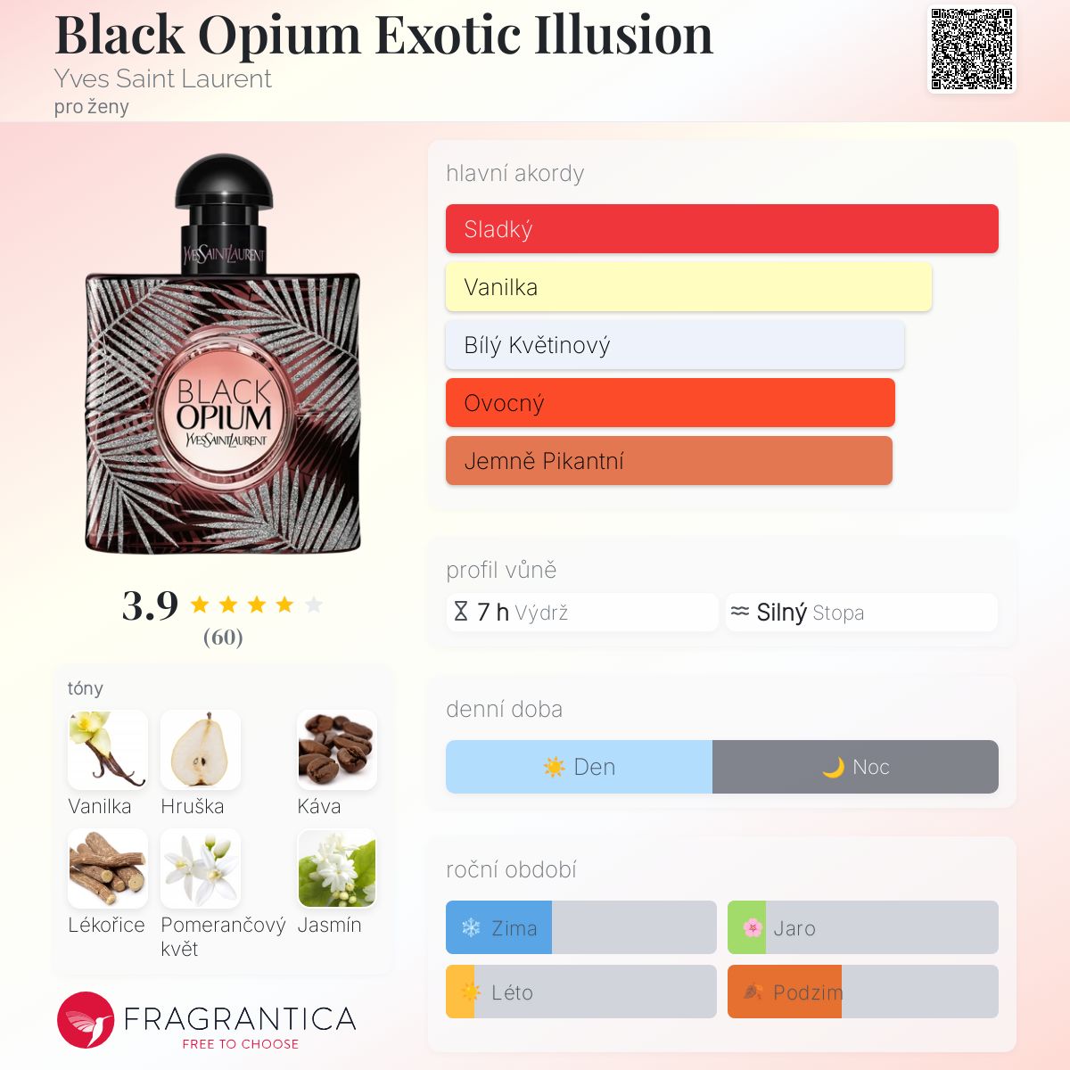 Black Opium Exotic Illusion podle Yves Saint Laurent je Orientální Vanilla vůně pro ženy. Black Opium Exotic Illusion byl/a uveden/a v roce 2019. Black Opium Exotic Illusion byl/a vytvořen/a Nathalie Lorson, Marie Salamagne, Olivier Cresp a Honorine Blanc. Vrchní tóny jsou Hruška, Pomerančový květ a Růžový pepř; střední tóny jsouKáva, Lékořice, Jasmín a Mandle ; základní tóny jsou Vanilka, Cedr, Pačuli a Kašmírové dřevo.
