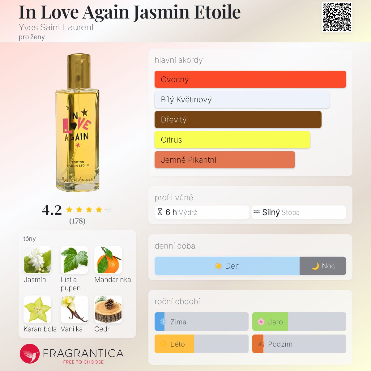 In Love Again Jasmin Etoile podle Yves Saint Laurent je Floral Fruity vůně pro ženy. In Love Again Jasmin Etoile byl/a uveden/a v roce 2005. Vrchní tóny jsou Černý rybíz, Mandarinka a Badyán; střední tóny jsouJasmín a Karambola ; základní tóny jsou Vanilka, Virginský cedr a Santalové dřevo.