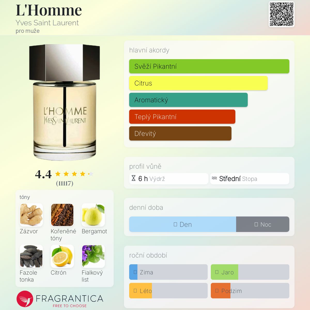 L'Homme podle Yves Saint Laurent je Woody Floral Musk vůně pro muže. L'Homme byl/a uveden/a v roce 2006. L'Homme byl/a vytvořen/a Anne Flipo, Pierre Wargnye, Dominique Ropion a Juliette Karagueuzoglou. Vrchní tóny jsou Zázvor, Bergamot a Citrón; střední tóny jsouKoření, Fialkový list, Bílý pepř a Bazalka ; základní tóny jsou Fazole tonka, Cedr a Tahitský vetiver.