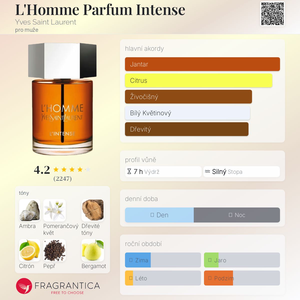 L'Homme Parfum Intense podle Yves Saint Laurent je Orientální Woody vůně pro muže. L'Homme Parfum Intense byl/a uveden/a v roce 2013. L'Homme Parfum Intense byl/a vytvořen/a Anne Flipo a Dominique Ropion. Vrchní tóny jsou Citrón, Černý pepř a Bergamot; střední tóny jsouPomerančový květ, Pelyněk a Fialkový list ; základní tóny jsou Ambra, Dřevité tóny, Benzoin, Kůže, Semiš a Cedr.