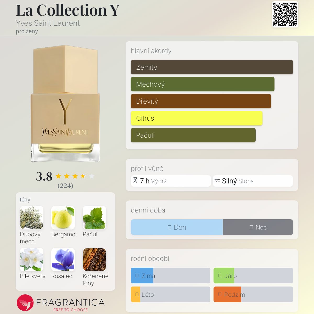 La Collection Y podle Yves Saint Laurent je Chypre Floral vůně pro ženy. La Collection Y byl/a uveden/a v roce 2011. Vrchní tóny jsou Bergamot a Koření; střední tóny jsouBílé květy, Kosatec a Růžový pepř ; základní tóny jsou Dubový mech a Pačuli.
