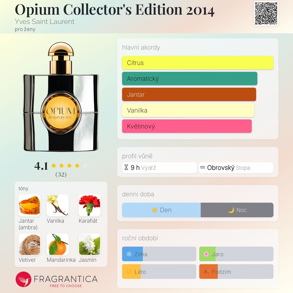 Opium Collector's Edition 2014 podle Yves Saint Laurent je Orientální Spicy vůně pro ženy. Opium Collector's Edition 2014 byl/a uveden/a v roce 2014. Vrchní tóny jsou Mandarinka a Bergamot; střední tóny jsouKarafiát a Jasmín ; základní tóny jsou Jantar (ambra), Vanilka a Vetiver.