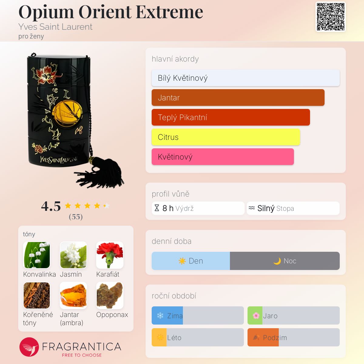 Opium Orient Extreme podle Yves Saint Laurent je Orientální Spicy vůně pro ženy. Opium Orient Extreme byl/a uveden/a v roce 2007. Vrchní tóny jsou Konvalinka, Mandarinka a Bergamot; střední tóny jsouJasmín, Karafiát a Koření ; základní tóny jsou Jantar (ambra), Opoponax, Vanilka a Pačuli.