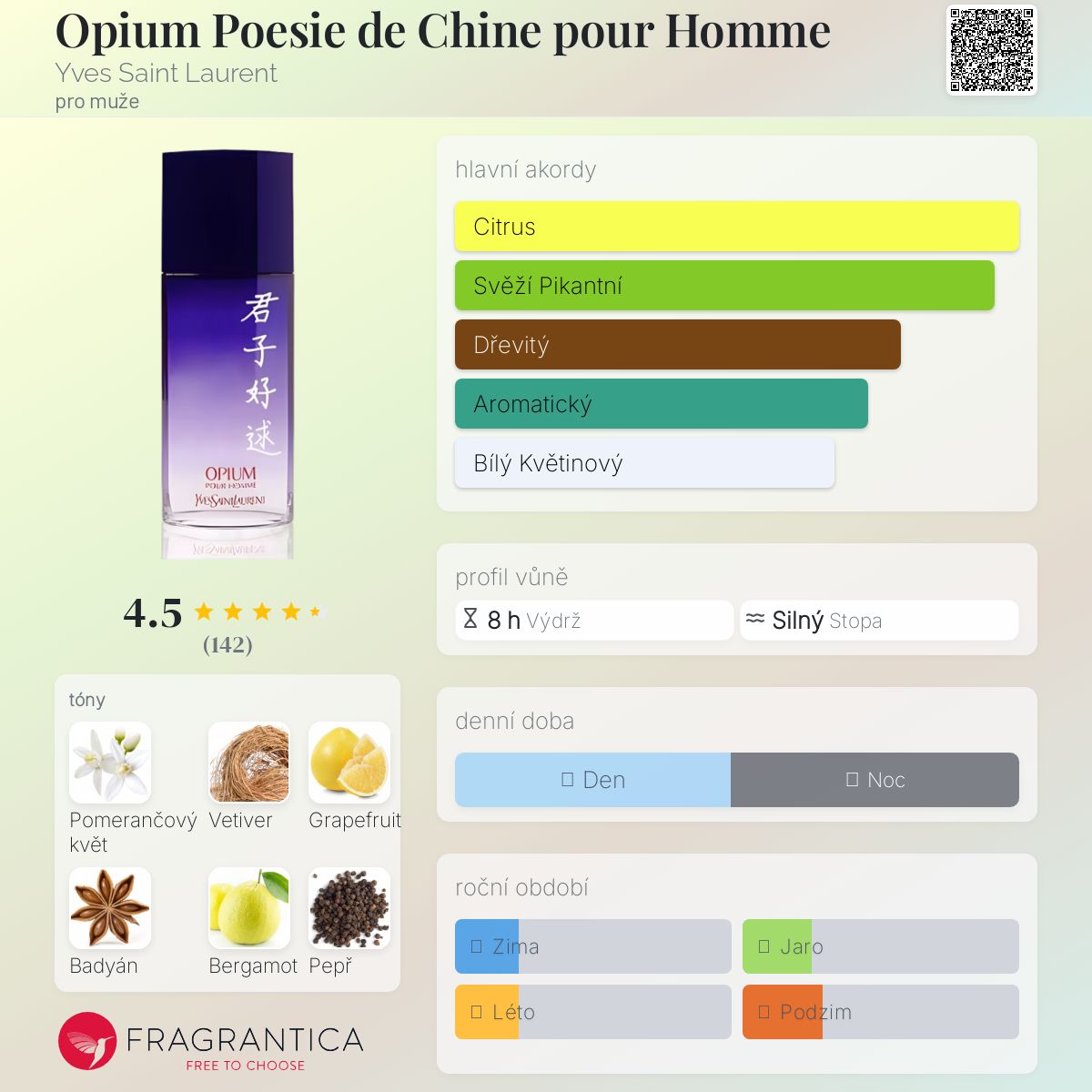 Opium Poesie de Chine pour Homme podle Yves Saint Laurent je Woody Aromatic vůně pro muže. Opium Poesie de Chine pour Homme byl/a uveden/a v roce 2008. Vrchní tóny jsou Grapefruit, Badyán a Bergamot; střední tóny jsouPomerančový květ, Bílý pepř a Muškátový oříšek ; základní tóny jsou Vetiver, Santalové dřevo a Jantar (ambra).