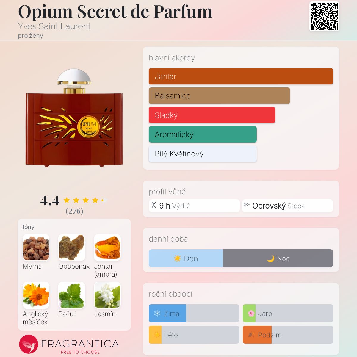 Opium Secret de Parfum podle Yves Saint Laurent je Orientální Spicy vůně pro ženy. Opium Secret de Parfum byl/a uveden/a v roce 1992. "Nosem" za touto vůní je Jean-Louis Sieuzac. Vrchní tóny jsou Mandarinka, Bergamot a Konvalinka; střední tóny jsouČervená myrha, Měsíček a Jasmín ; základní tóny jsou Opoponax, Jantar (ambra), Pačuli a Vanilka.