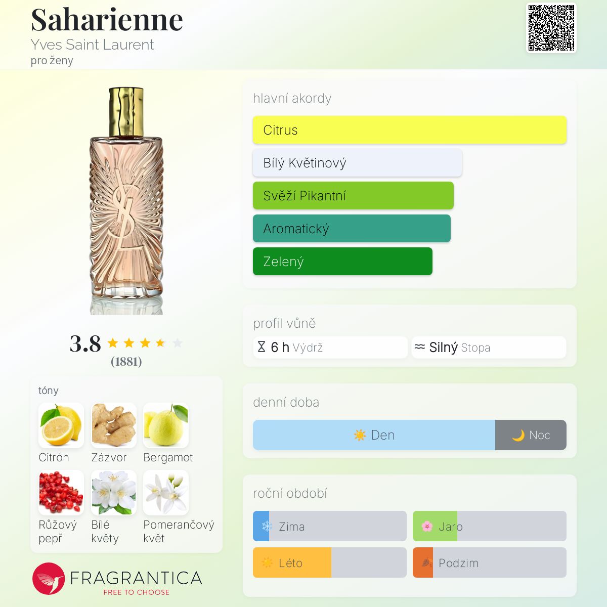 Saharienne podle Yves Saint Laurent je Citrus Aromatic vůně pro ženy. Saharienne byl/a uveden/a v roce 2011. Vrchní tóny jsou Citron amalfi , Bergamot a Mandarinka; střední tóny jsouBílé květy, Květ afrického pomeranče, Černý rybíz, Galbanum a Petitgrain ; základní tóny jsou Zázvor a Růžový pepř.