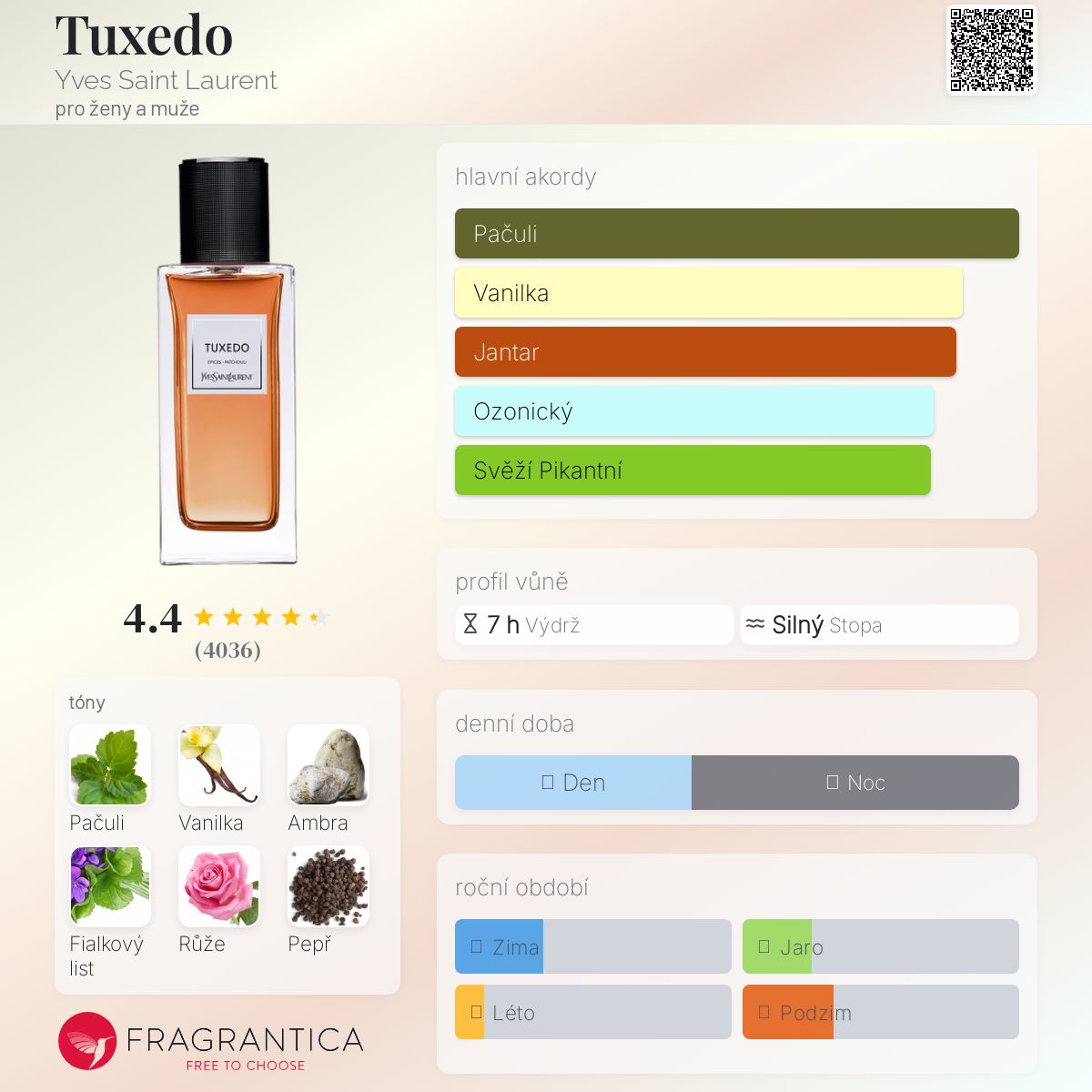 Tuxedo podle Yves Saint Laurent je Chypre vůně pro ženy a muže. Tuxedo byl/a uveden/a v roce 2015. "Nosem" za touto vůní je Juliette Karagueuzoglou. Vrchní tóny jsou Fialkový list, Koriandr a Bergamot; střední tóny jsouRůže, Černý pepř a Konvalinka ; základní tóny jsou Pačuli, Bourbonská vanilka a Ambra.