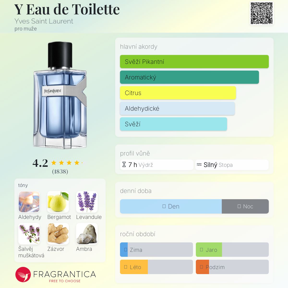 Y Eau de Toilette podle Yves Saint Laurent je vůně pro muže. Y Eau de Toilette byl/a uveden/a v roce 2022. "Nosem" za touto vůní je Dominique Ropion. Vrchní tóny jsou Aldehydy, Bergamot a Zázvor; střední tóny jsouLevandule, Šalvěj muškátová a Pelargónie ; základní tóny jsou Ambra, Cedr, Vanilka a Olibanum.