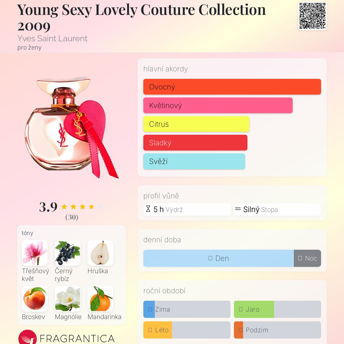 Young Sexy Lovely Couture Collection 2009 podle Yves Saint Laurent je Floral Fruity vůně pro ženy. Young Sexy Lovely Couture Collection 2009 byl/a uveden/a v roce 2009. Vrchní tóny jsou Černý rybíz, Hruška a Mandarinka; střední tóny jsouTřešňový květ, Broskev a Magnólie ; základní tóny jsou Pižmo, Virginský cedr a Jantar (ambra).