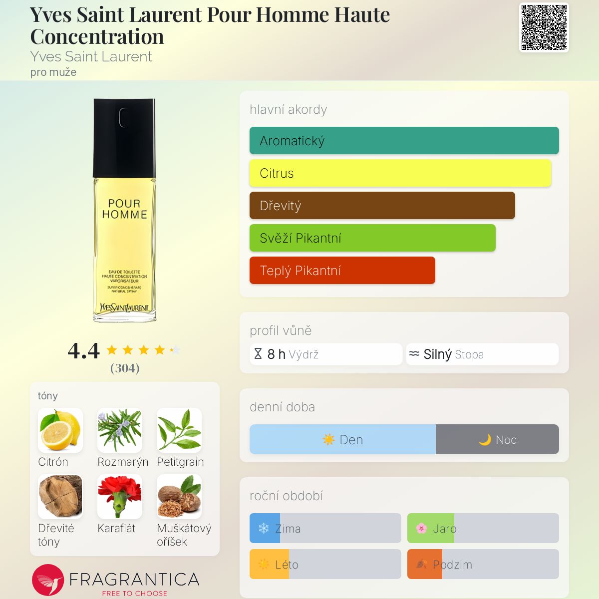 Yves Saint Laurent Pour Homme Haute Concentration podle Yves Saint Laurent je Woody Aromatic vůně pro muže. Yves Saint Laurent Pour Homme Haute Concentration byl/a uveden/a v roce 1983. Vrchní tóny jsou Citron amalfi , Petitgrain a Karafiát; střední tóny jsouRozmarýn, Pačuli a Fazole tonka ; základní tóny jsou Dřevité tóny a Muškátový oříšek.